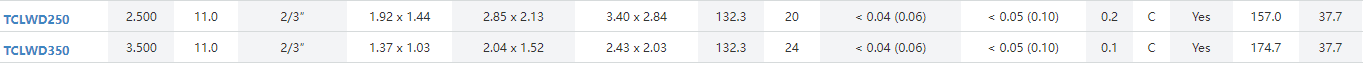 | TCLWD100 | 1.000 | 11.0 | 2/3″ | 4.80 x 3.60 | 7.13 x 5.33 | 8.50 x 7.09 | 132.3 | 12 | < 0.04 (0.06) | < 0.05 (0.10) | 0.6 | C | Yes | 126.0 | 37.7 |